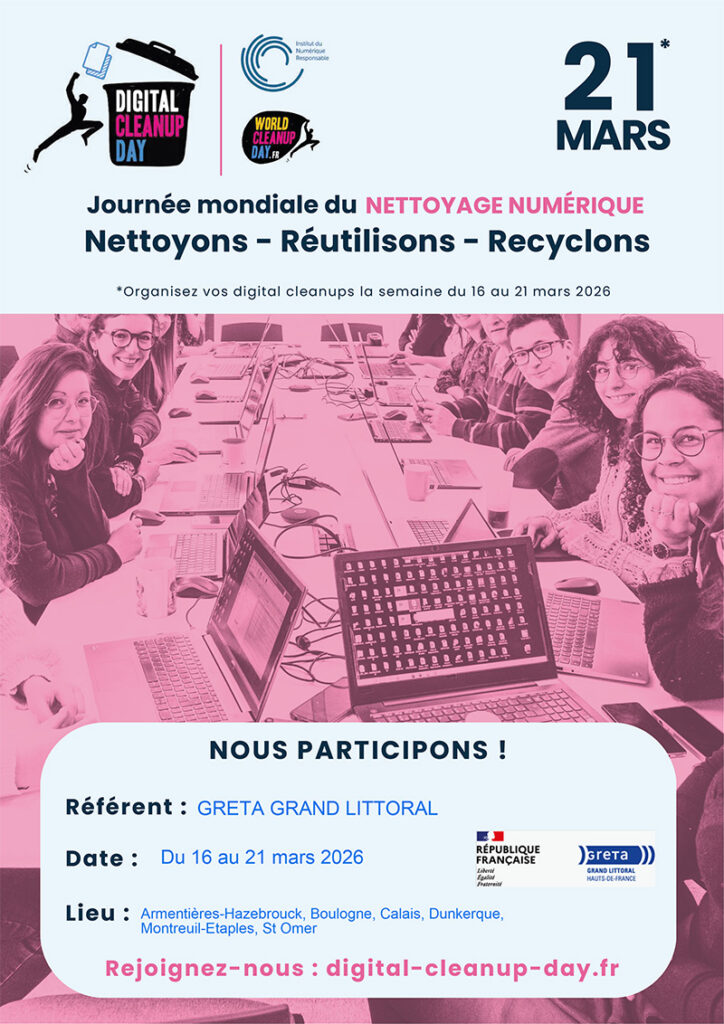Du 16 au 21 mars 2026, le GRETA Grand Littoral participe à la 7ᵉ édition du Digital Cleanup Day, une initiative mondiale dédiée à la réduction de l’empreinte environnementale du numérique.